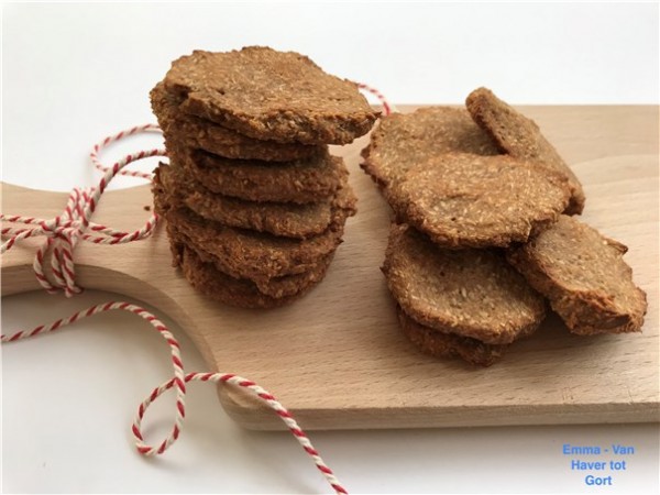 Bak vervolgens de koekjes in ±25 minuten goudbruin. Als de koekjes net uit de oven komen zijn ze nog wat zacht, maar als ze afgekoeld zijn worden ze knapperig. Het beste kun je de koekjes in een afgesloten trommel in de koelkast bewaren. Helaas worden de koekjes dan wel wat zachter. Vind je dit niet lekker dan kun je ze voor gebruik een paar minuutjes in de oven “opbakken”. Laat ze wat afkoelen en je hebt weer een knapperig koekje.